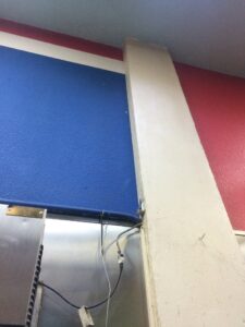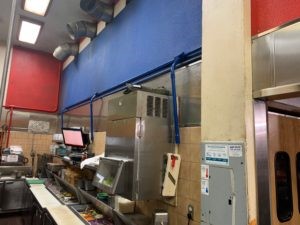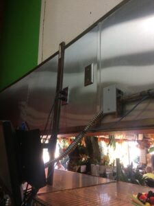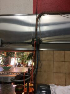 Here is the kitchen island, fed from that draped cable… what a disaster. The power is an issue there as well. Everything duct taped together and sticky as well as the grease. Too much exposed wiring, not cleanable… Yuck.