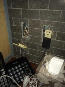 what a hazard and so un-cool. This was an office nook. I had to use a Dremel on the tile so I could mount the new face plates correctly and use some extra long screws! I found some color matching face plates for the phone and electrical. When I was done, it looked PRO! (forgot to take an after photo… argh!)