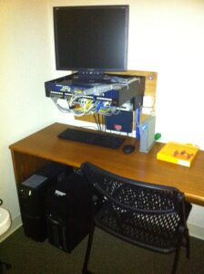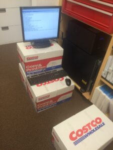 Here is a server in the copier room with a UPS stacked on top. Not my design (prior IT guy). I had to set up a temporary work desk with the reams of paper they kept there. I tried to convince them to move this and set up something a little more professional but the owner would not listen to me. Ended up moving on from them. What good is having an IT consultant if you are not going to take his advice?