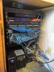 More of this client’s woes… the server closet was a disaster. Cables running all over the walls and very few of them had any slack. It did not help that when the prior IT guy upgraded infrastructure, he did not remove any of the old infrastructure. There were layers upon layers of old phone wiring, network wiring, cable wiring, etc… I did the best I could in bringing them to a workable and manageable platform. Here are the befores: