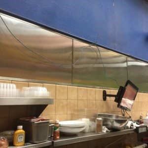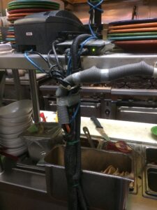 Here is the kitchen island, fed from that draped cable… what a disaster. The power is an issue there as well. Everything duct taped together and sticky as well as the grease. Too much exposed wiring, not cleanable… Yuck.