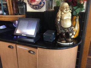 Kitchen window and corner area. Brought data from above and ran power from the UPS below the printer. As little exposure as possible. The electrical you do see is for their refrigeration. This was a tremendous amount of detail work and a lot of pulling wire. Not sure they appreciate or understand the complexity and time it took… Let alone the fact that all work had to be performed between 9:30pm and 2am.